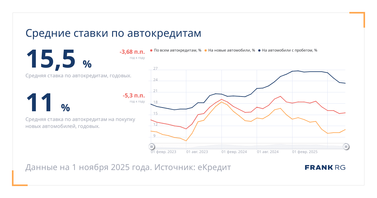 Средняя ставка по автокредитам, годовых.