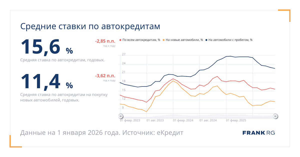 Средняя ставка по автокредитам на покупку новых автомобилей, годовых.