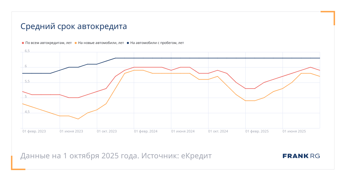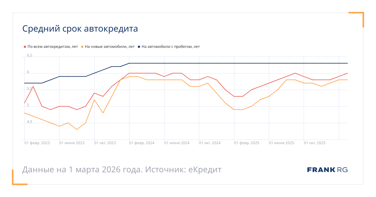 Дата | Средний срок автокредитов в месяц, лет | Средний срок автокредитов на новые автомобили за месяц, лет | Средний срок автокредитов на автомобили с пробегом за месяц, лет |