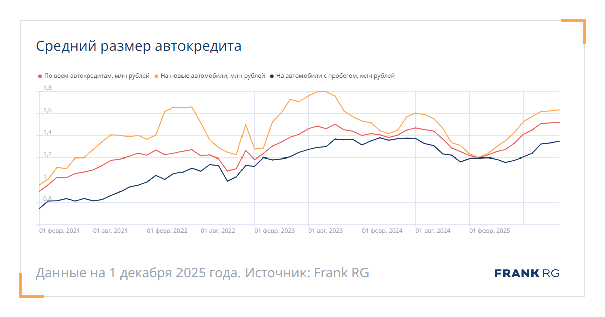 Дата | Средний чек автокредитов в месяц, млн рублей | Средний чек автокредитов на новые автомобили в месяц, млн рублей | Средний чек автокредитов на автомобили с пробегом в месяц, млн рублей |