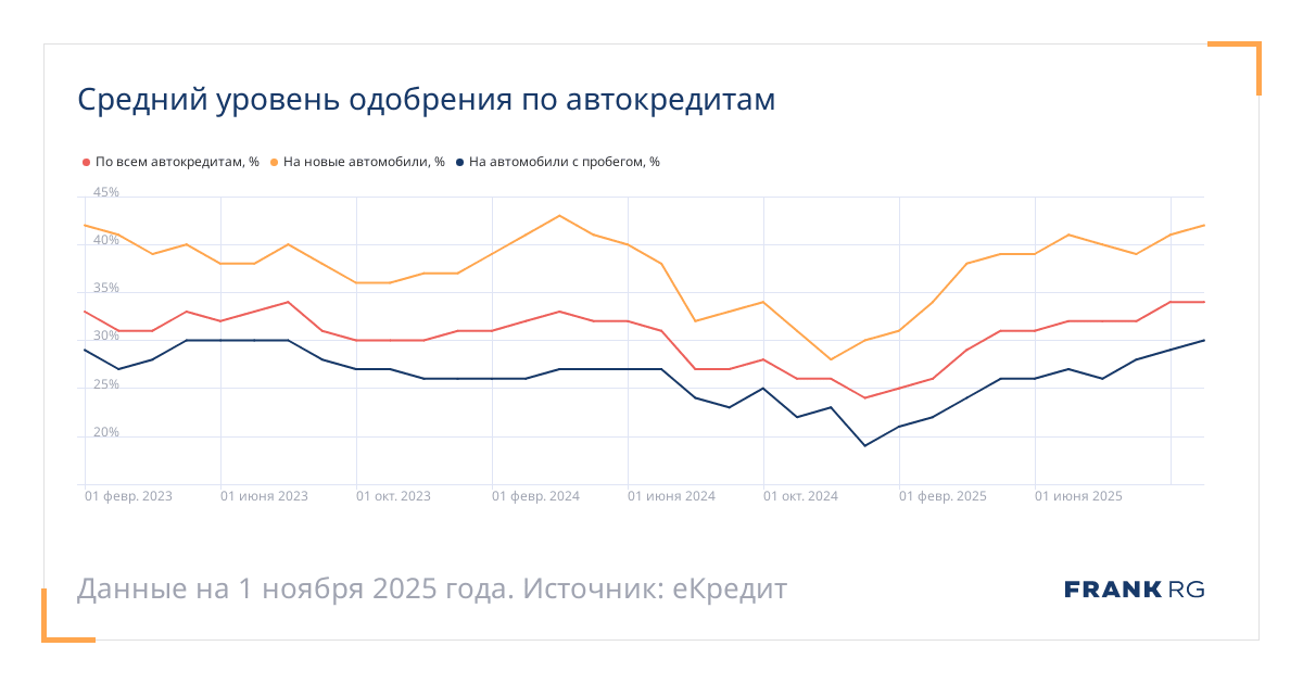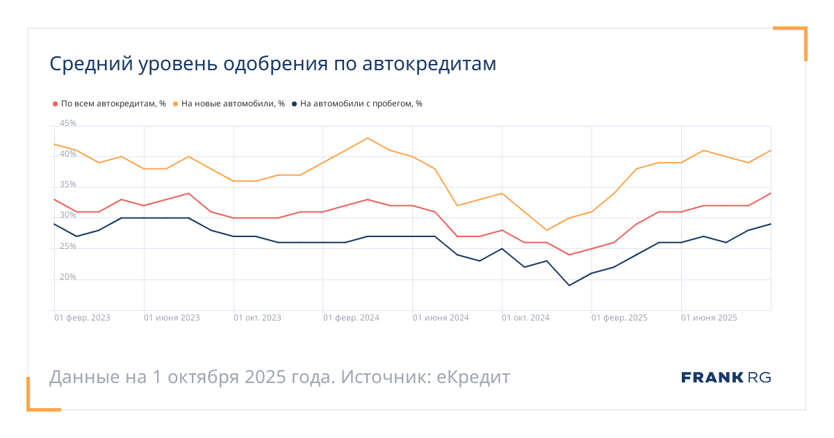 Дата | Средний уровень одобрения по автокредитам в месяц, % | Средний уровень одобрения по автокредитам в месяц на новые автомобили, % | Средний уровень одобрения по автокредитам в месяц на автомобили с пробегом, % |