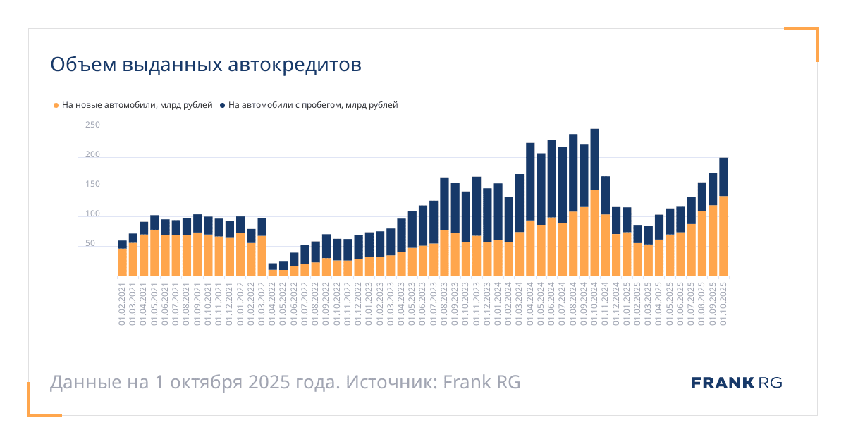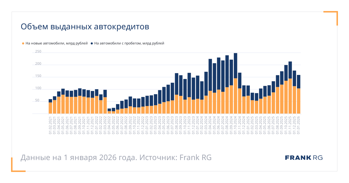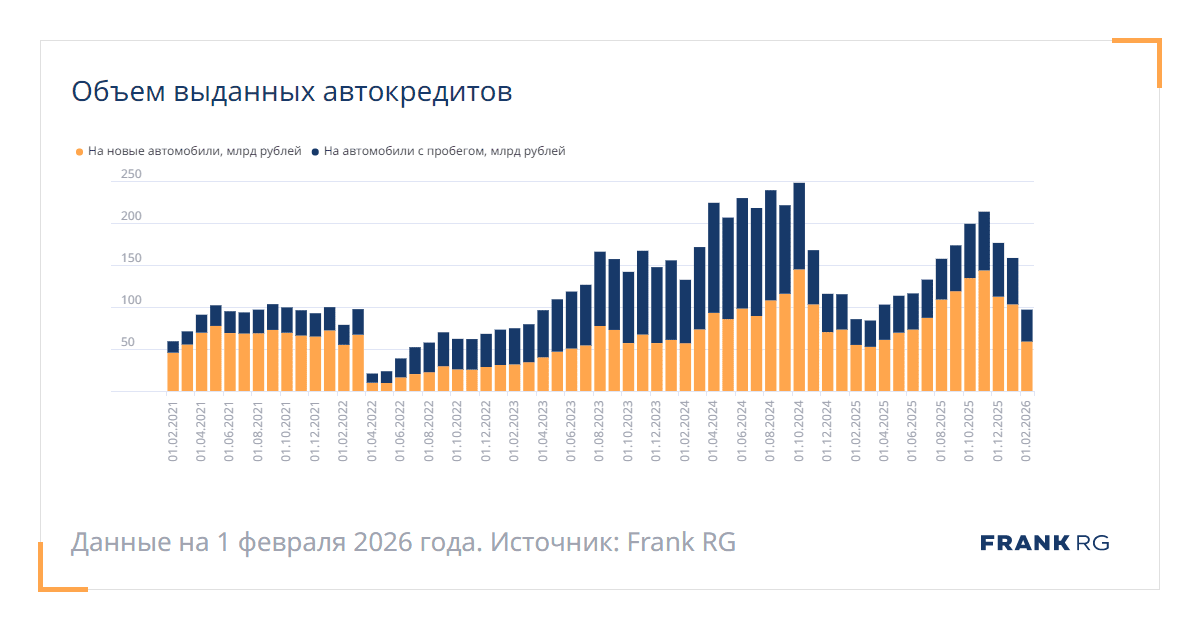 Дата | Общий объем выданных автокредитов в месяц, млрд рублей | Объем выданных автокредитов в месяц на новые автомобили, млрд рублей | Объем выданных автокредитов в месяц на автомобили с пробегом, млрд рублей |