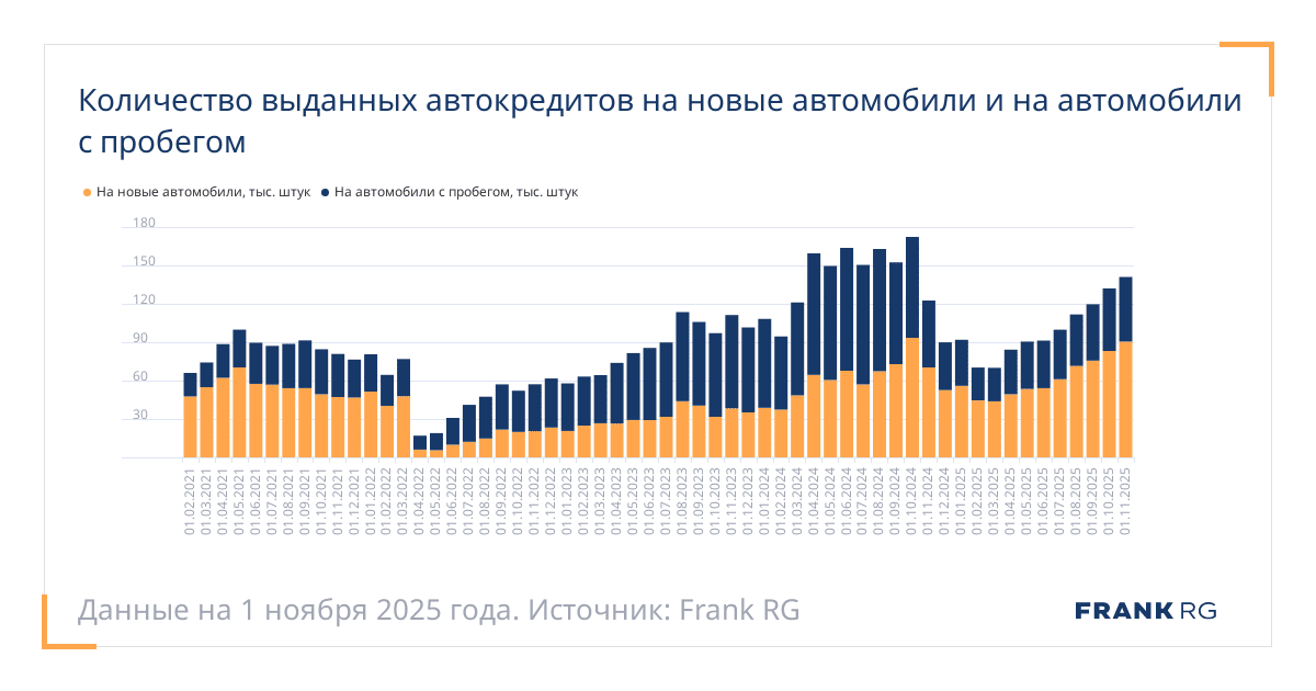 Дата | Количество выданных автокредитов в месяц, тыс. штук | Количество выданных автокредитов в месяц на новые автомобили, тыс. штук | Количество выданных автокредитов в месяц на автомобили с пробегом, тыс. штук |