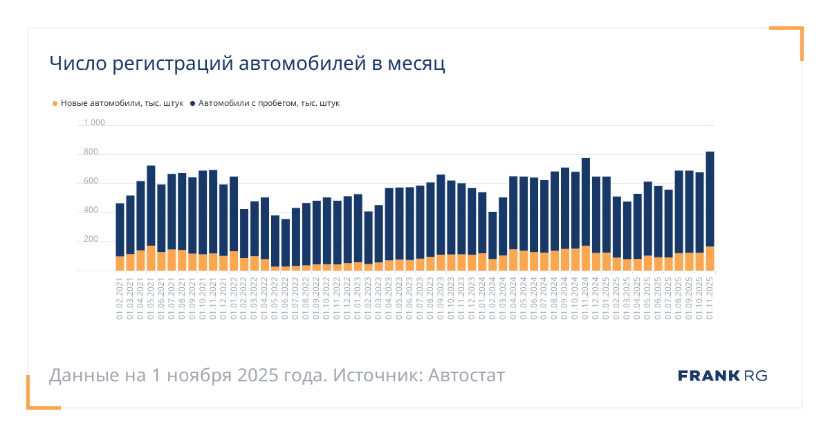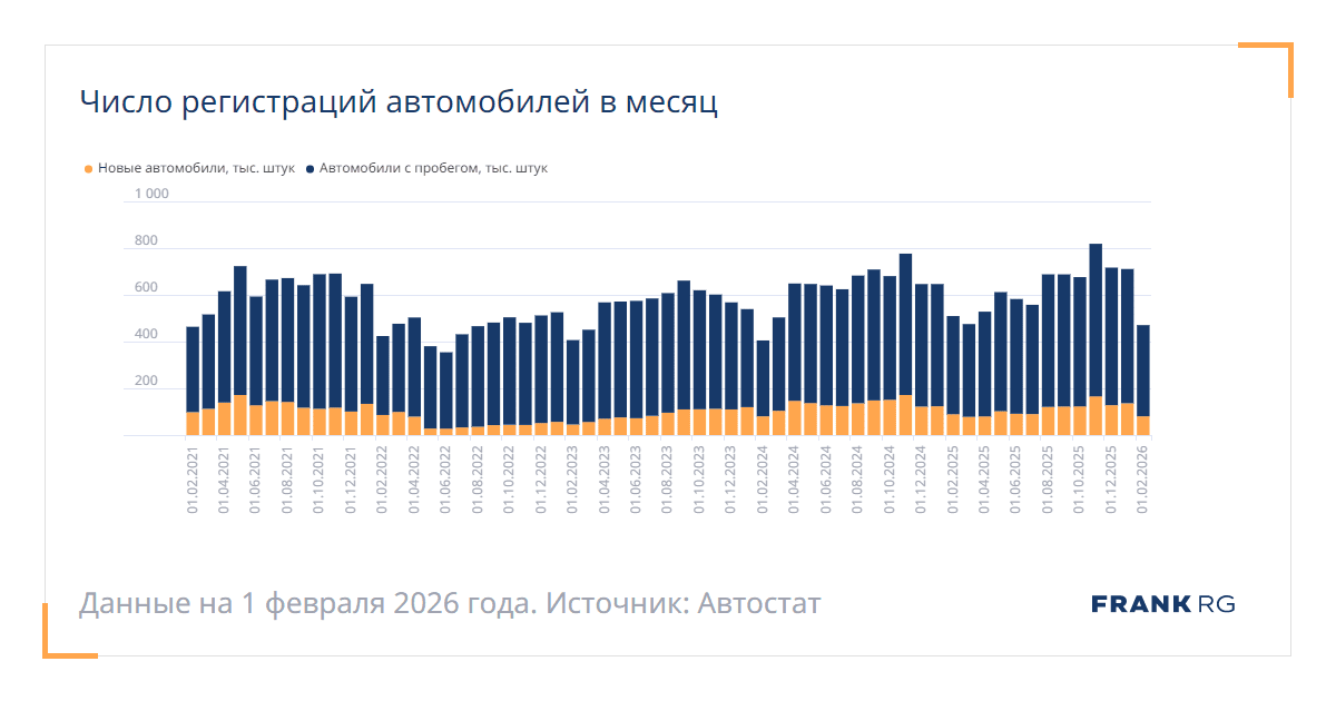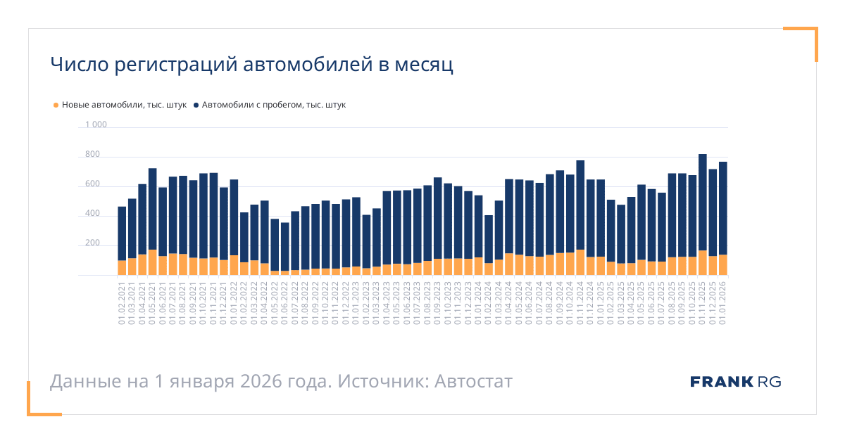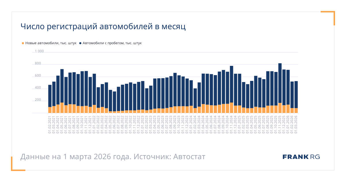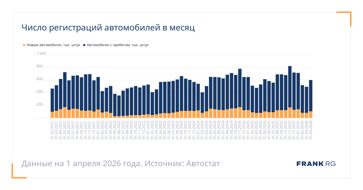 Дата | Число регистраций в месяц, тыс. штук | Число регистраций новых автомобилей в месяц, тыс. штук | Число регистраций автомобилей с пробегом в месяц, тыс. штук |