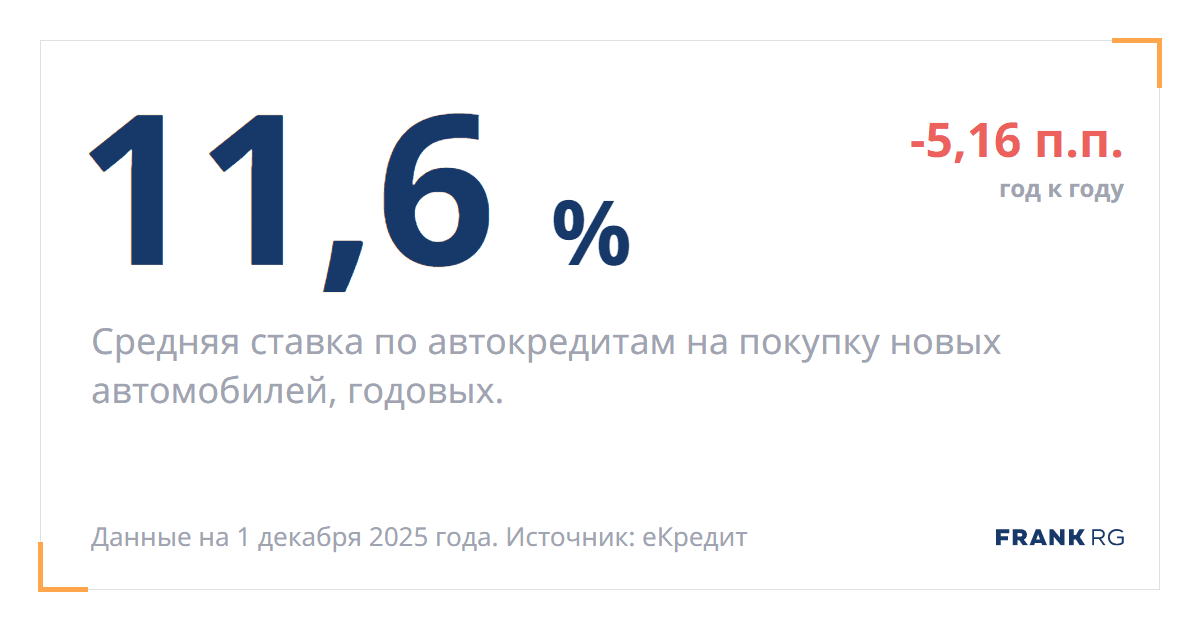 Средняя ставка по автокредитам на покупку новых автомобилей, годовых.
