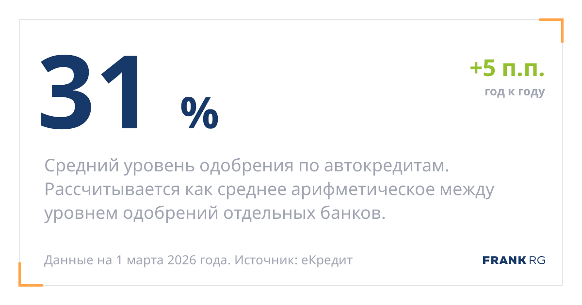 Средний уровень одобрения по автокредитам. Рассчитывается как среднее арифметическое между уровнем одобрений отдельных банков.