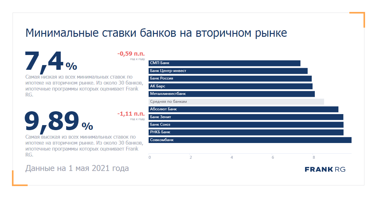 Самая высокая из всех минимальных ставок по ипотеке на вторичном рынке. Из около 30 банков, ипотечные программы которых оценивает Frank RG.