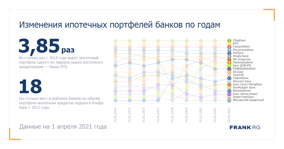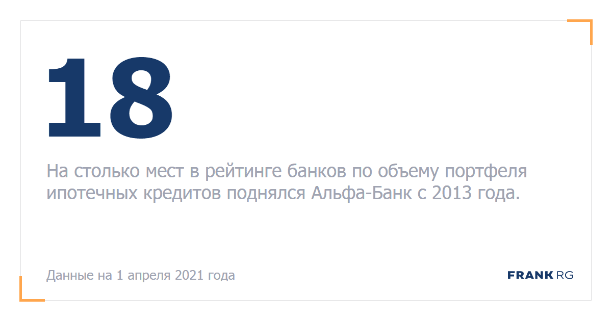 На столько мест в рейтинге банков по объему портфеля ипотечных кредитов поднялся Альфа-Банк с 2013 года.