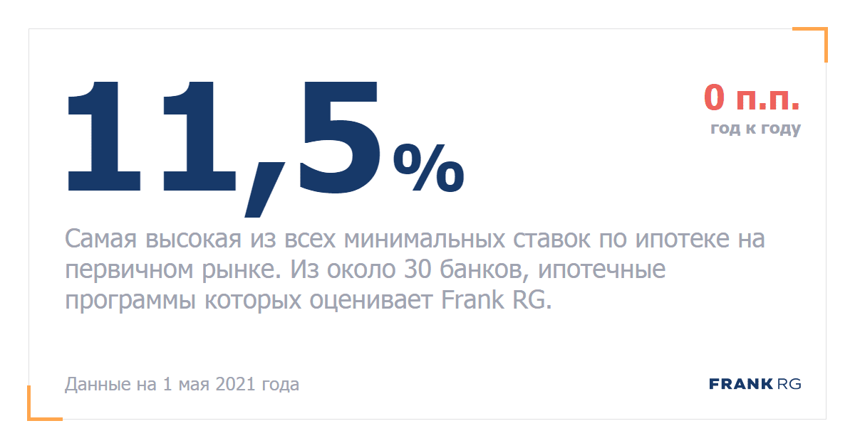 Самая высокая из всех минимальных ставок по ипотеке на первичном рынке. Из около 30 банков, ипотечные программы которых оценивает Frank RG.