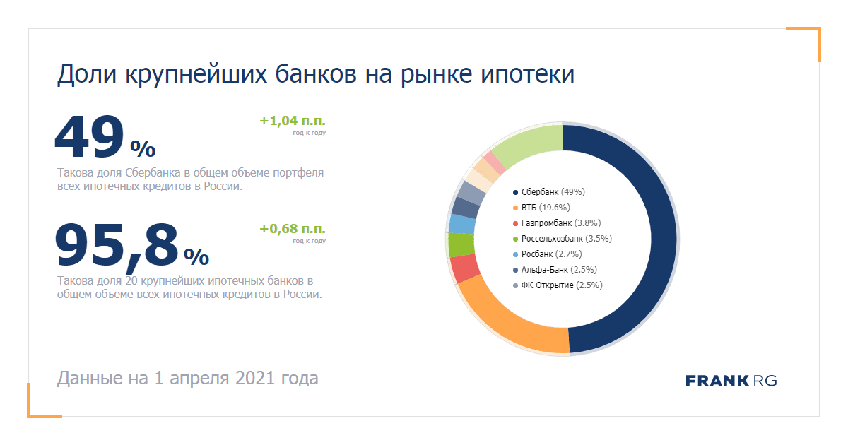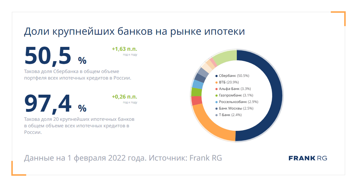 Такова доля 20 крупнейших ипотечных банков в общем объеме всех ипотечных кредитов в России.