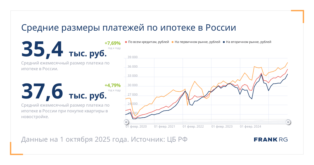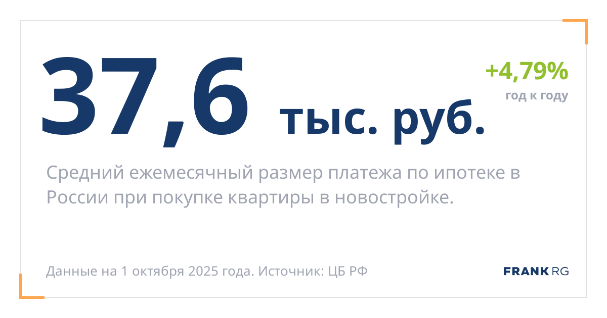 Средний ежемесячный размер платежа по ипотеке в России при покупке квартиры в новостройке.