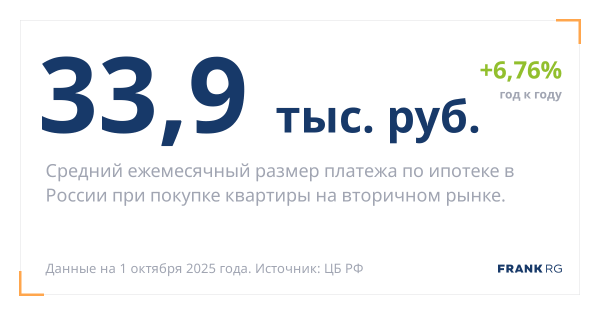 Средний ежемесячный размер платежа по ипотеке в России при покупке квартиры на вторичном рынке.