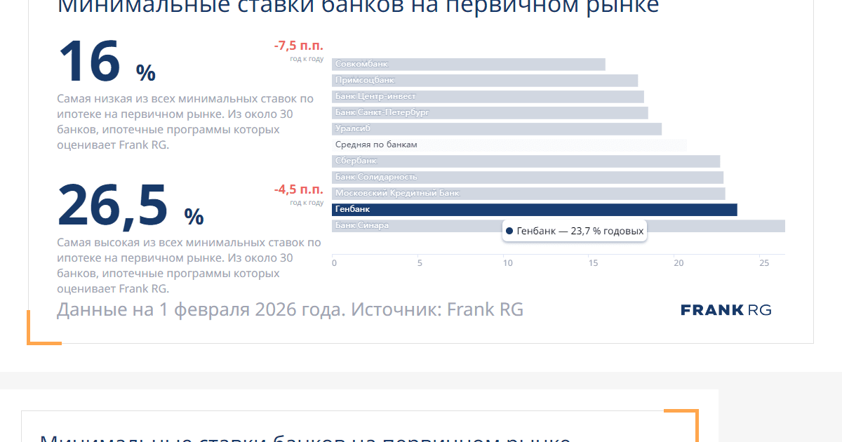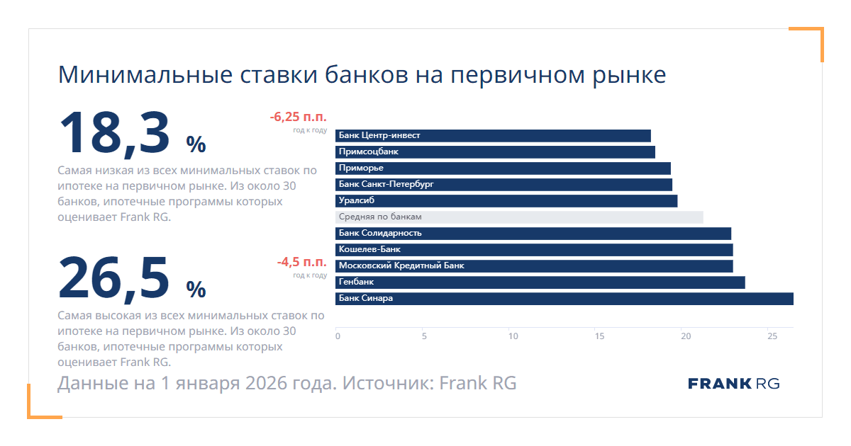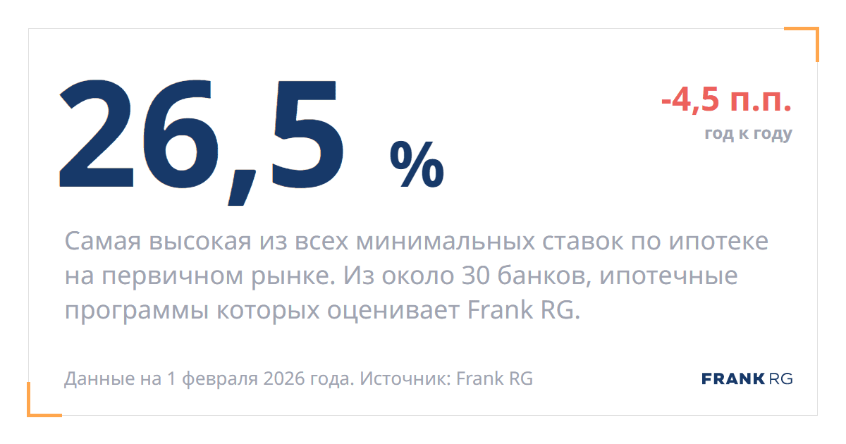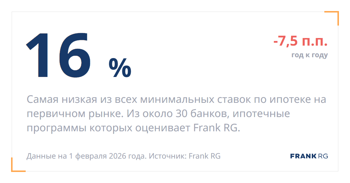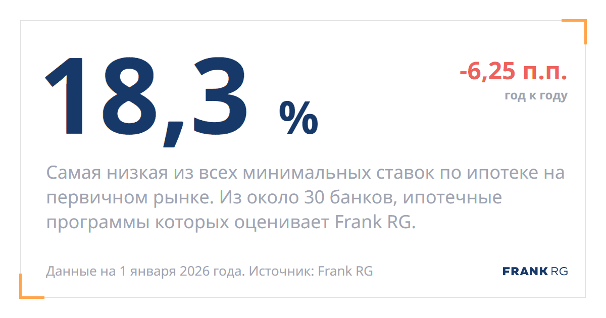 Самая низкая из всех минимальных ставок по ипотеке на первичном рынке. Из около 30 банков, ипотечные программы которых оценивает Frank RG.