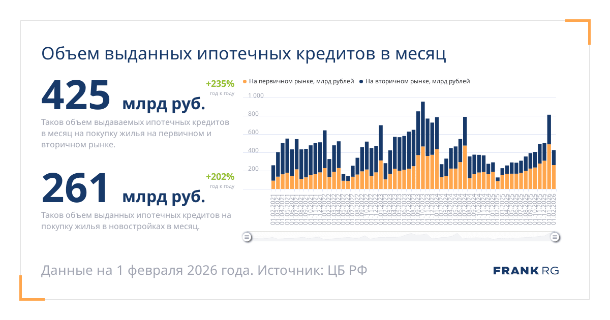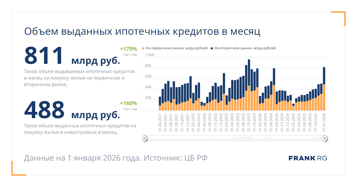 Таков объем выдаваемых ипотечных кредитов в месяц на покупку жилья на первичном и вторичном рынке.