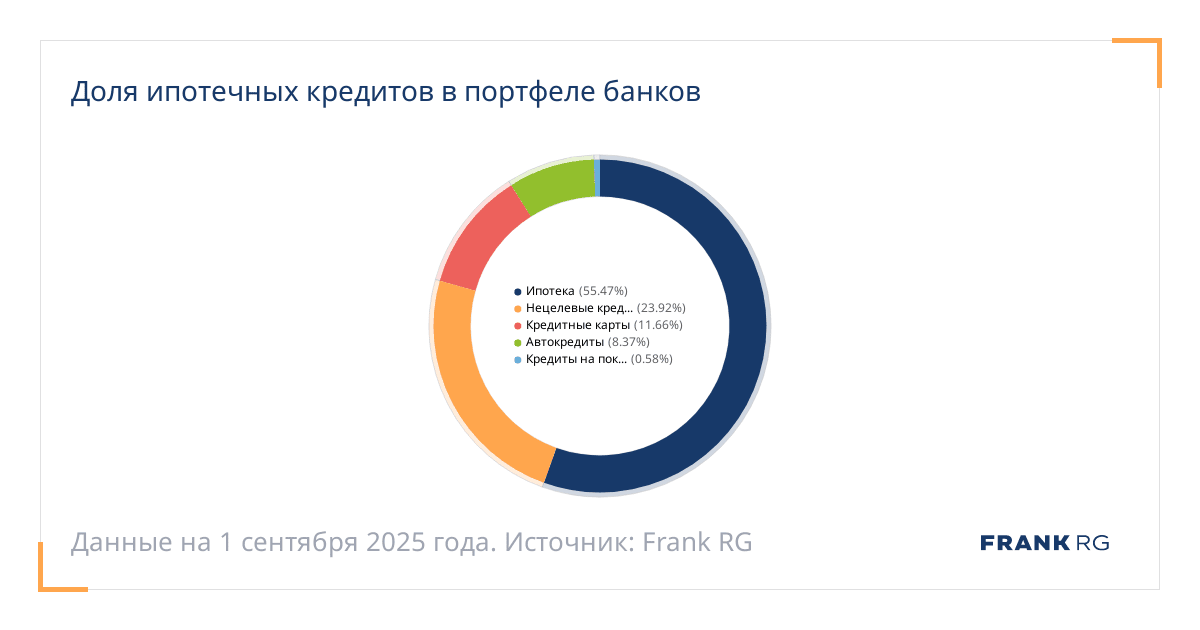 Портфель ипотечных кредитов составляет почти половину всех кредитов, выданных банками населению. На втором месте — кредиты наличными. На их фоне кредиты по картам или на покупку товаров выглядят каплей в море.