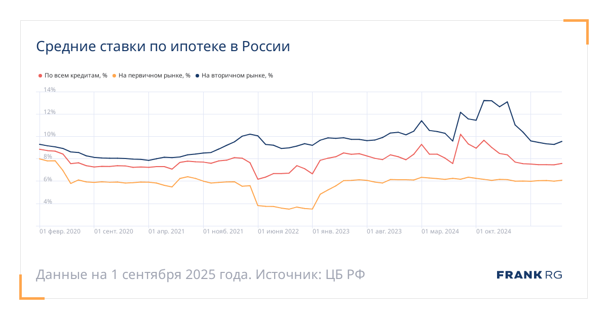 Дата | Средневзвешенная ставка по ипотечным кредитам в России, % | Средневзвешенная ставка по ипотечным кредитам на первичном рынке, % | Средневзвешенная ставка по ипотечным кредитам на вторичном рынке, % |