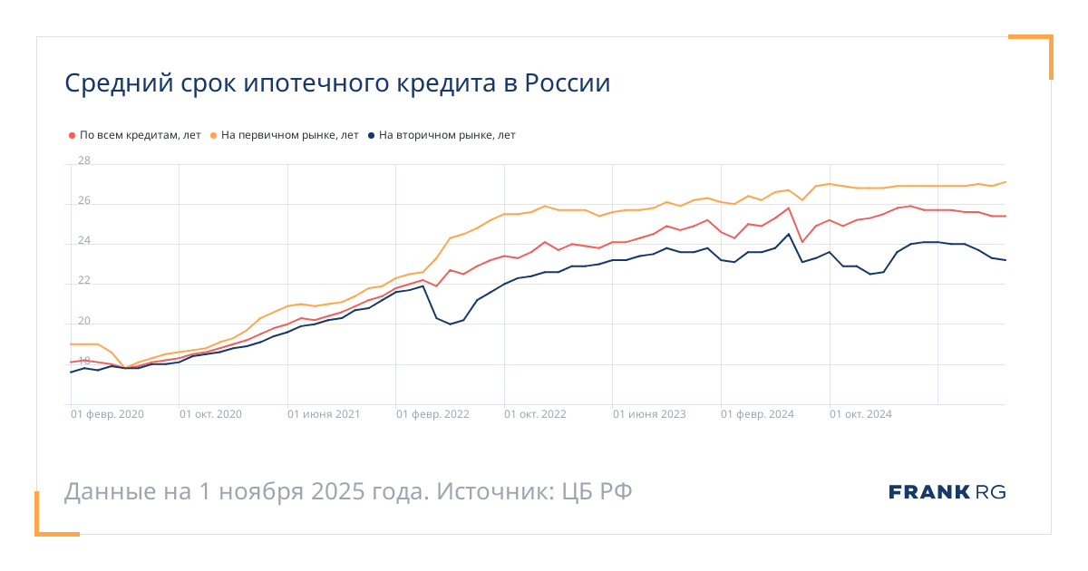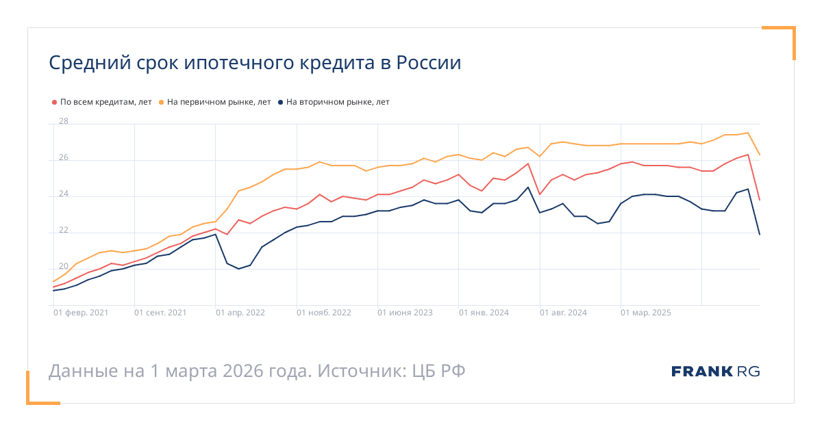 Средние сроки ипотечных кредитов в России растут на протяжении последних трех лет. Это может говорить о том, что людям все труднее нести долговую нагрузку по таким кредитам, и они сокращают размер ежемесячных выплат, увеличивая срок. Средний срок ипотечных кредитов будет расти и дальше.