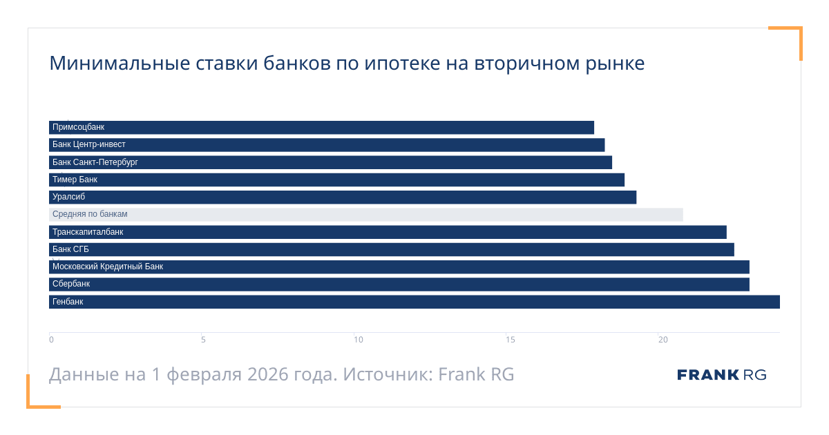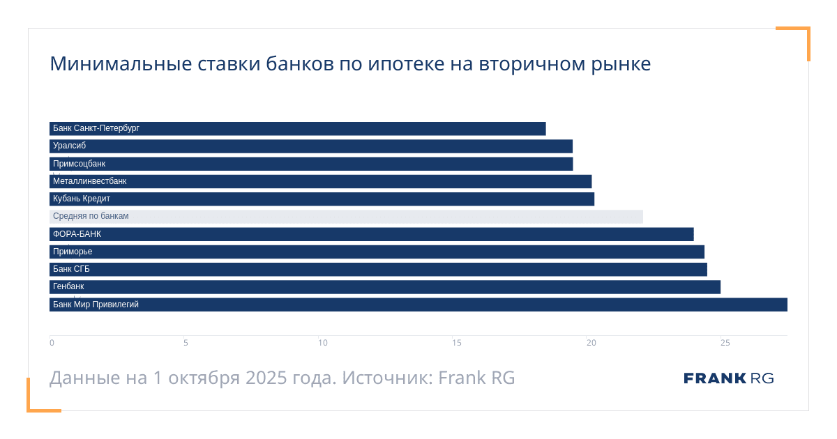 Это данные мониторинга Frank RG по минимальным ставкам ипотечных программ на вторичном рынке около 30 крупнейших банков. Условия: город Москва, вторичный рынок, цена квартиры — 6 млн рублей, кредит — 4,2 млн рублей, первоначальный взнос — 30%, срок — 15 лет. Чтобы узнать ставки для других регионов или условий, необходимо быть подписаными на наш продукт «Мониторинг банковских ставок и тарифов».