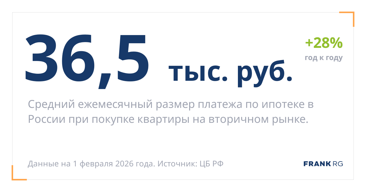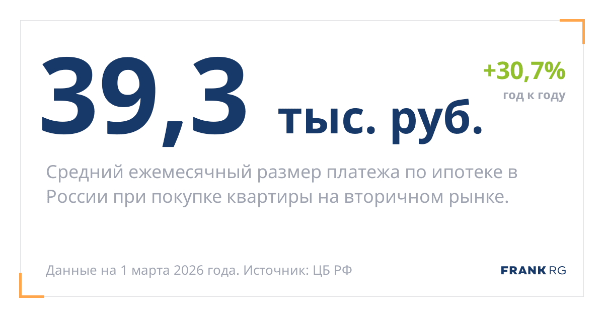 Средний ежемесячный размер платежа по ипотеке в России при покупке квартиры на вторичном рынке.