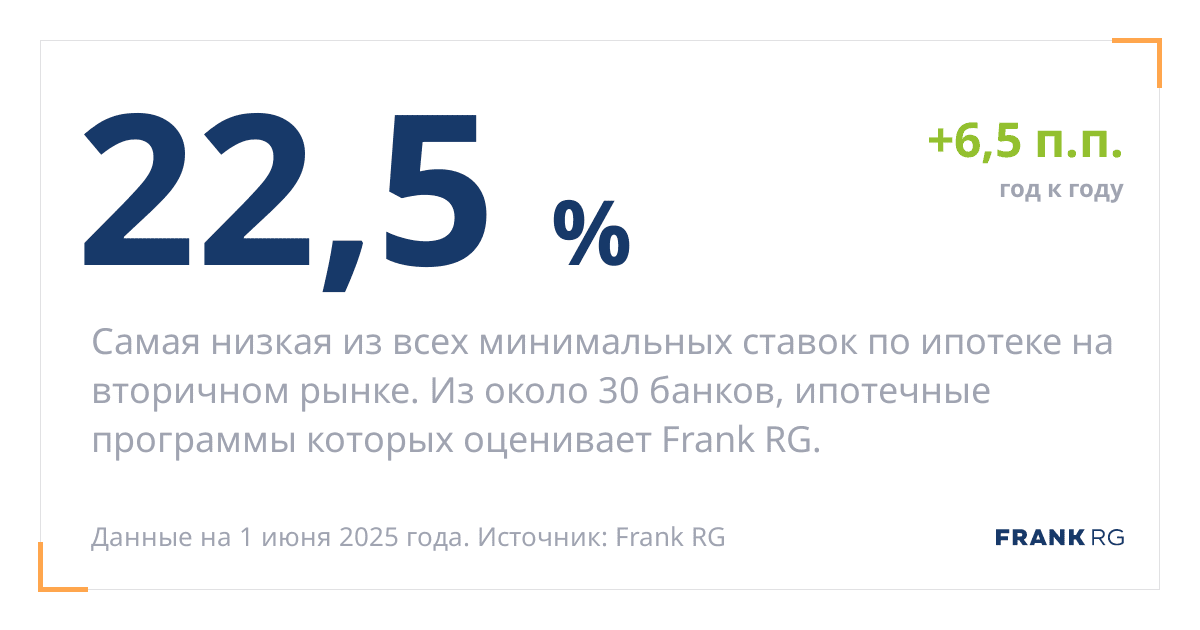Самая низкая из всех минимальных ставок по ипотеке на вторичном рынке. Из около 30 банков, ипотечные программы которых оценивает Frank RG.
