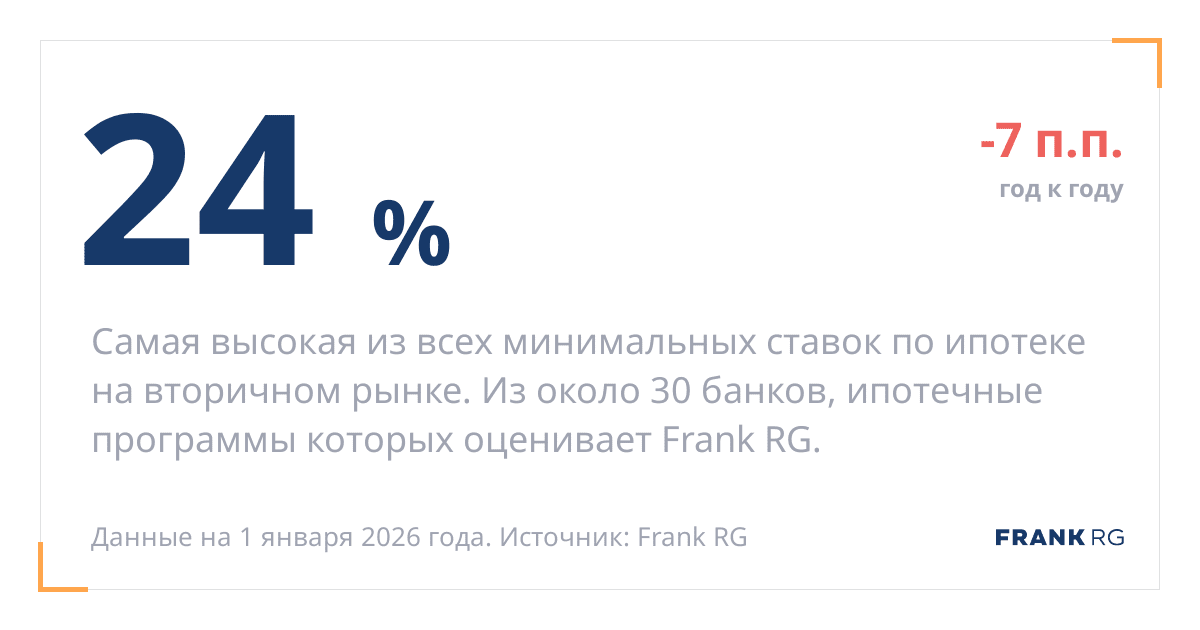 Самая высокая из всех минимальных ставок по ипотеке на вторичном рынке. Из около 30 банков, ипотечные программы которых оценивает Frank RG.