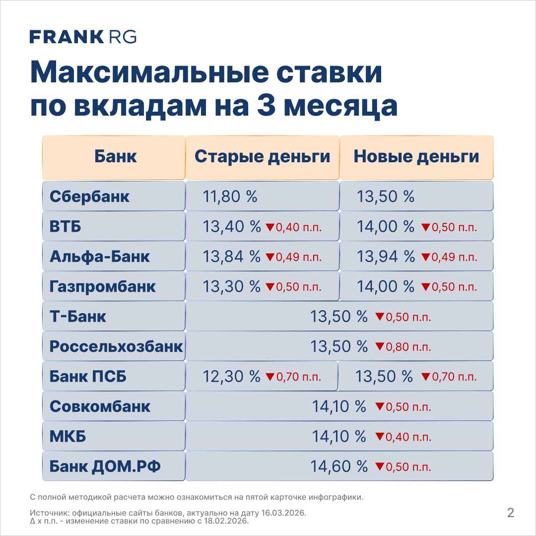 По данным Frank RG, падение доходности по депозитам на 3 и 6 месяцев зафиксировано во всех анализируемых банках — они сильнее всего привязаны к текущей ключевой ставке.