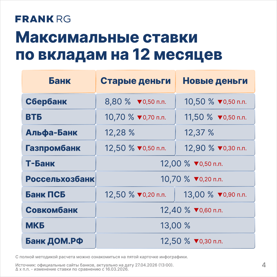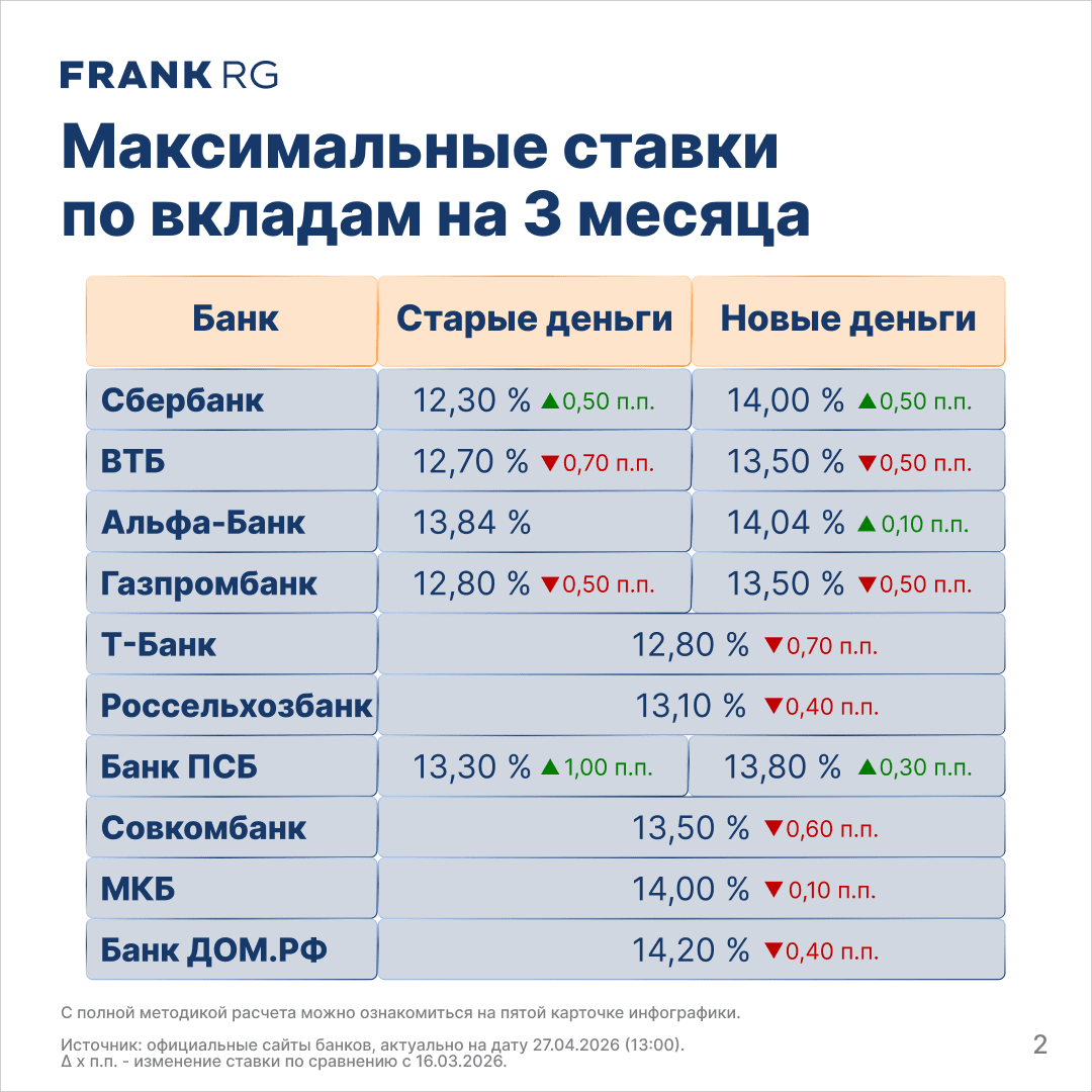 По данным Frank RG, средняя максимальная ставка по вкладам в топ‑10 крупнейших банков на 27 апреля составила 13,8% (−0,4 п.п. к уровню 16 марта).